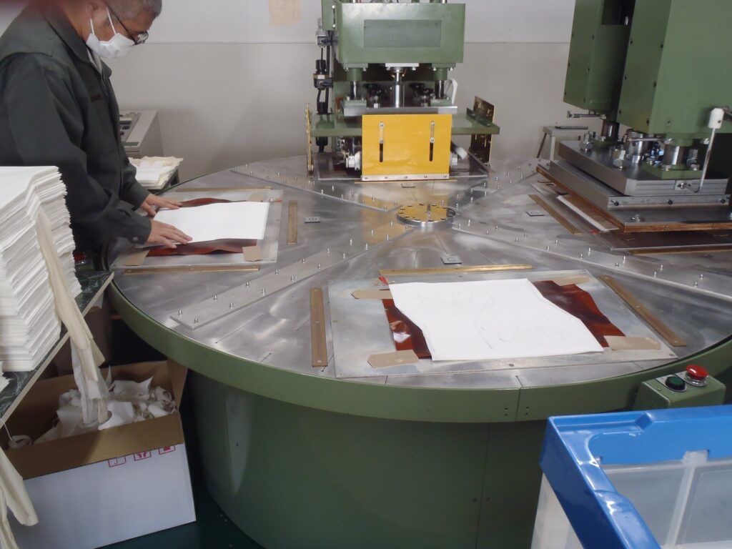 「水を通さない」「破れにくい」「着け心地が良い」 そう感じていただける裏には、このターンテーブルの上で繰り広げられる、熱と圧力のドラマがあるのです。