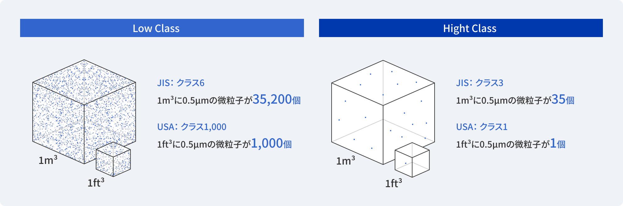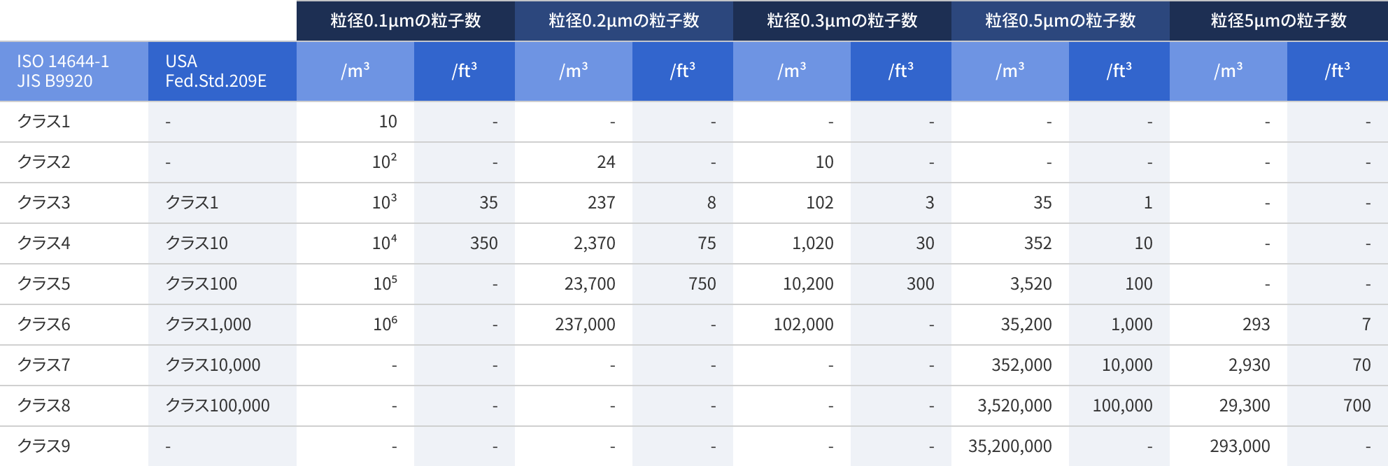 洗浄度を表すクラスは微粒子(浮遊する塵)の数を表しているので、数字が小さいほど高性能、数字が大きいほど一般環境に近くなります。